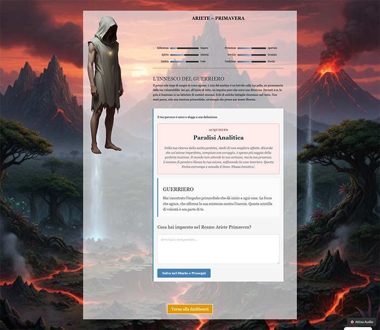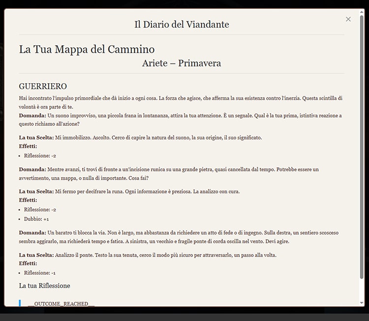 - Il Diario del Viandante: Il tuo specchio interattivo che traccia ogni tua singola scelta, Dono e Ferita in tempo reale.