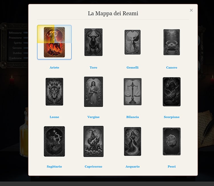 Il percorso è una “Grande Opera” divisa in tre fasi (Nigredo, Albedo, Rubedo) che si sviluppa attraverso 48 tappe (le 4 stagioni di ogni segno). In ogni tappa, incontrerai un archetipo (come il Guerriero , il Sovrano , la Guaritrice o il Ribelle ) e sarai chiamato a fare scelte difficili.
